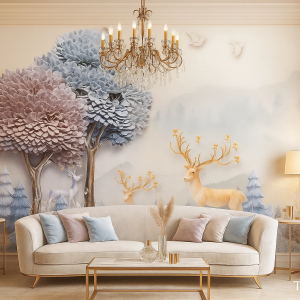 پوستر دیواری سهبعدی طرح جنگل رویایی و گوزنهای زرین