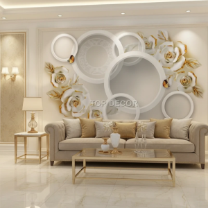 پوستر دیواری سهبعدی طرح گلهای رز و حلقههای سفید